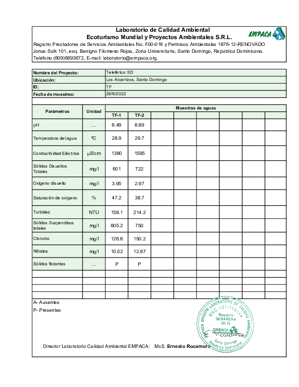 Anexo 2.13 Muestreo Aguas EMPACA 2022 | Ministerio de Medio Ambiente y Recursos Naturales
