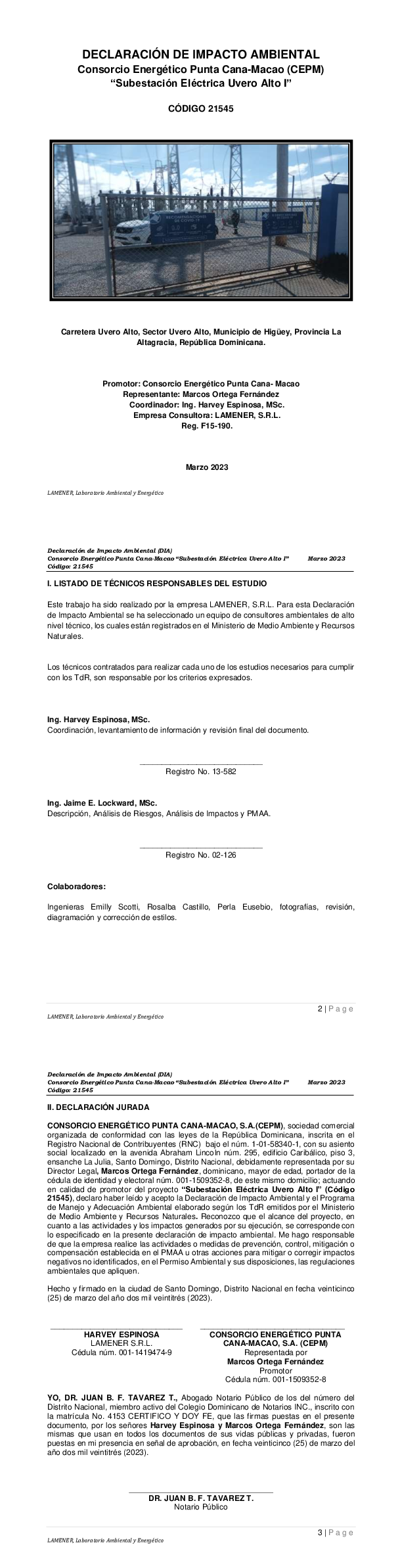 Declaración CEPM Subestación UVERO ALTO I | Ministerio de Medio Ambiente y Recursos Naturales