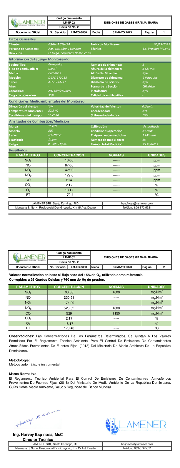 GRANJA THAIRA - Emisiones de Gases Generador 05-05-2022 | Ministerio de Medio Ambiente y Recursos Naturales